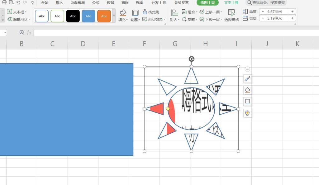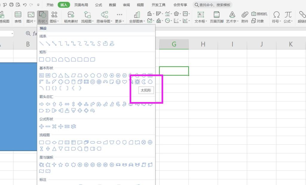 3、我们还可以利用形状制作创意图片,先选择一个形状绘制在表格中,例如太阳形。