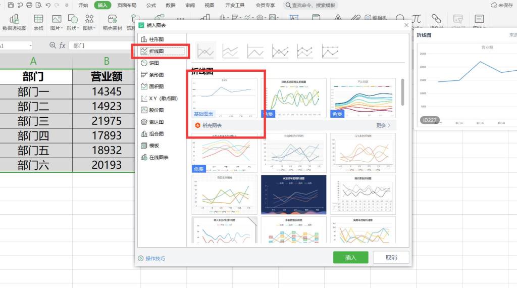 3、选择折线图,点击一个自己喜欢的并点击插入到表格中。