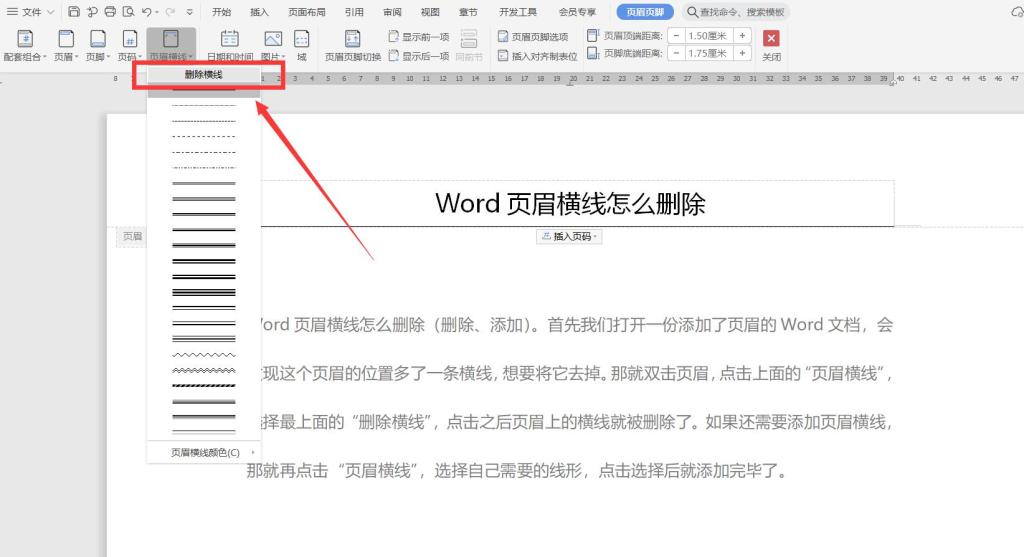 2、想要将它去掉,那就双击页眉,点击上面的“页眉横线”,选择最上面的“删除横线”。