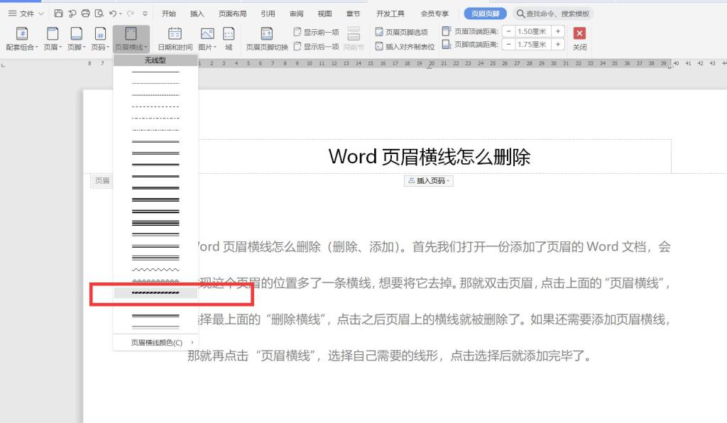 4、如果还需要添加页眉横线,那就再点击“页眉横线”,选择自己需要的线形。