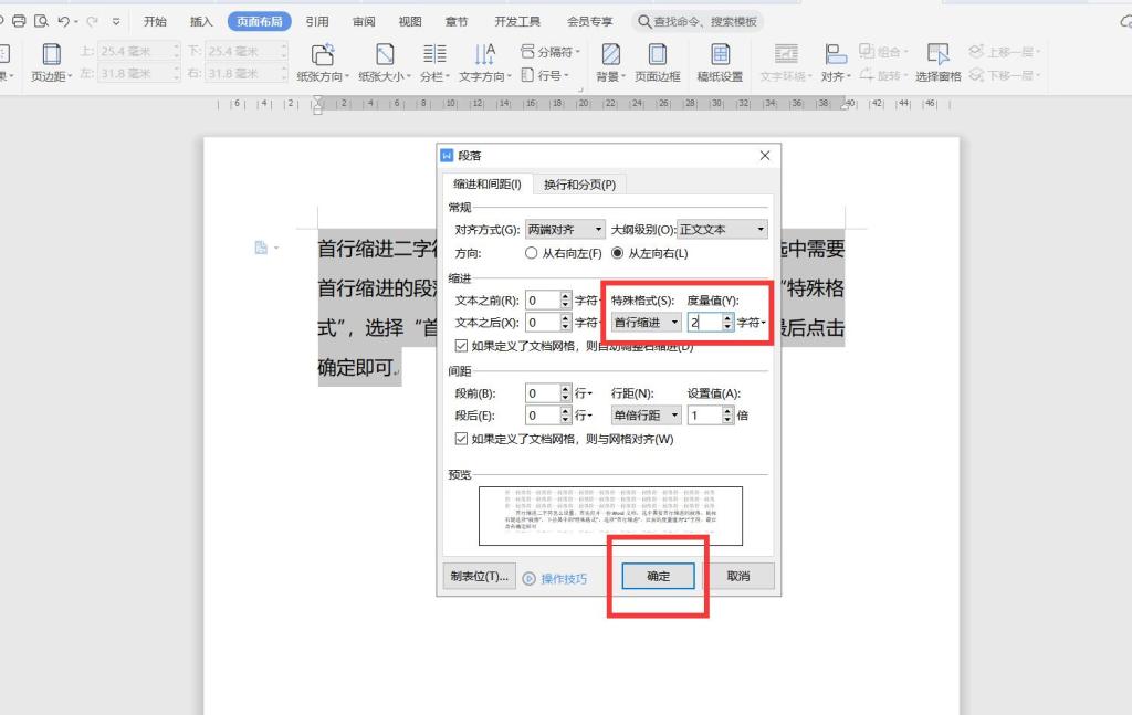 3、下拉其中的“特殊格式”,选择“首行缩进”,后面的度量值为“2”字符。