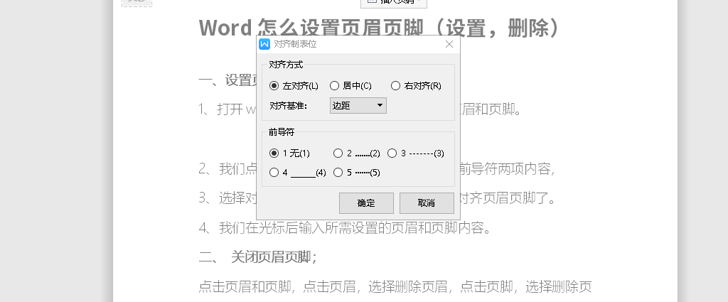 3、选择对齐方式居中,前导符选择1无,就可以对齐页眉页脚了。