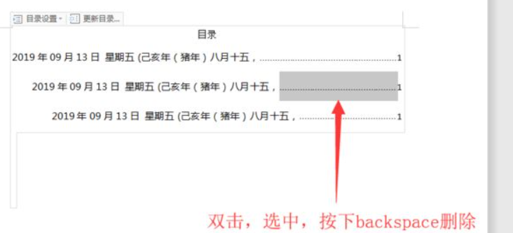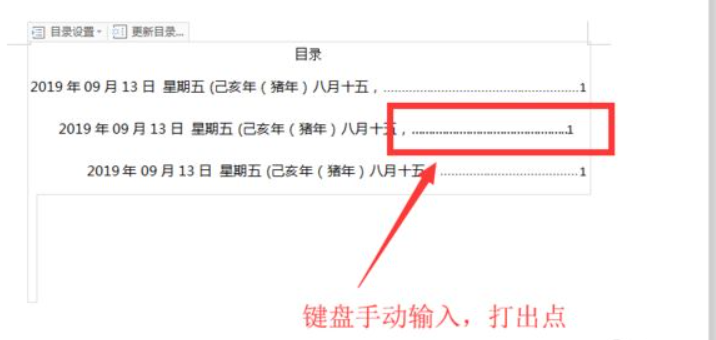 5、想要手动输入点符号的话,可以双击鼠标左键选中目录中的点,然后按下键盘的backspace键,删除点。