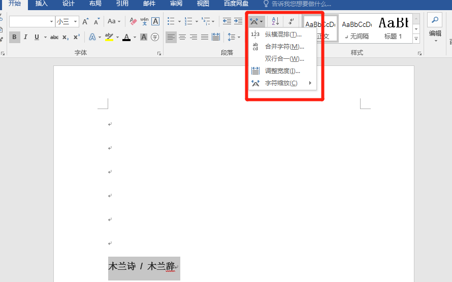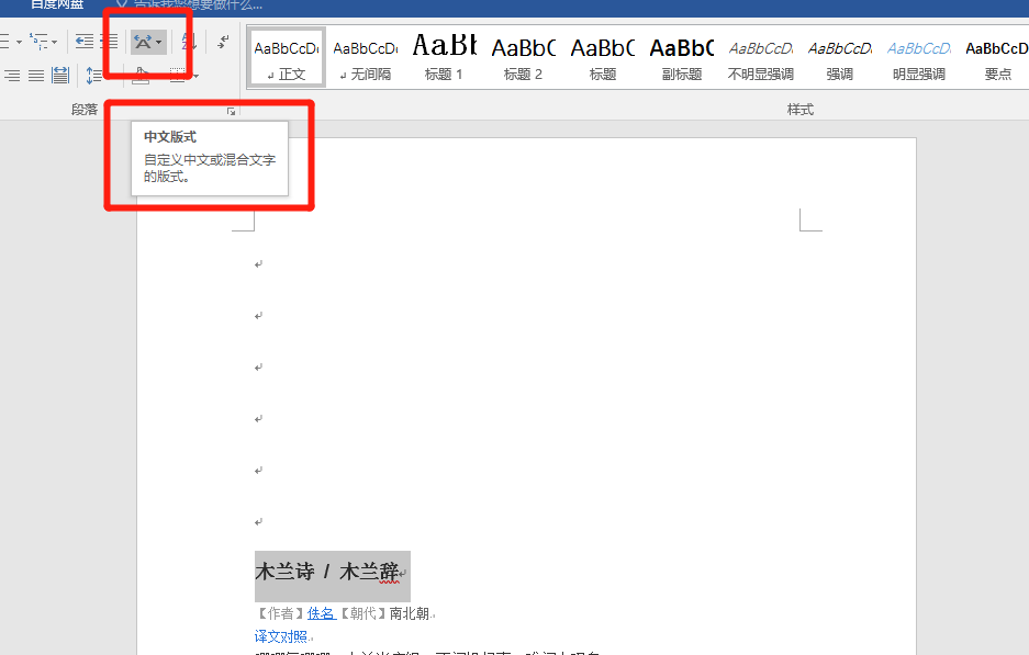 2、选中需要设置的文字,在开始界面中的顶部工具栏中,找到中文版式功能。