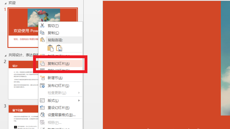 在右击PPT展开的选项中,点击复制幻灯片即可。