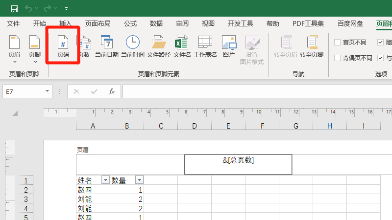 在展开的页眉和页脚中,选择页码即可。
