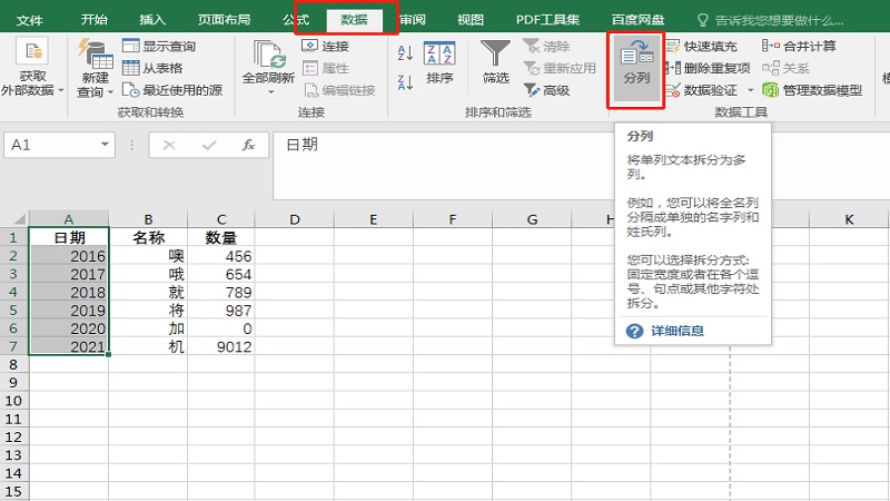 excel分列单元格可以用4步完成。以Excel2016举例具体步骤如下:- 1选中单元格