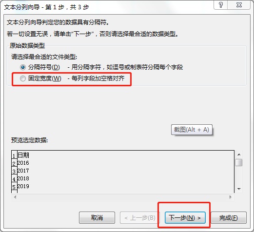 在弹出的窗口中,点击固定宽度,点击下一步。