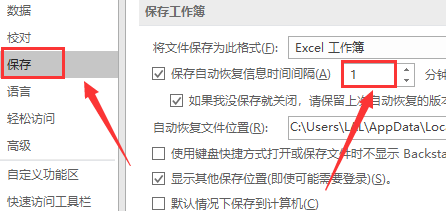 3、在弹出的“Excel选项”窗口中,点击“保存”选项,将“保存自动恢复信息时间间隔10分钟”,设置为1分钟。