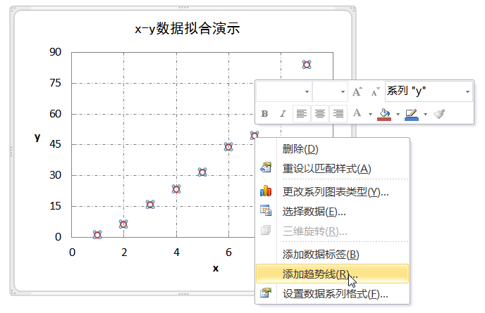 2、选中数据点,右击鼠标,在弹出菜单选择添加趋势线这一选项。
