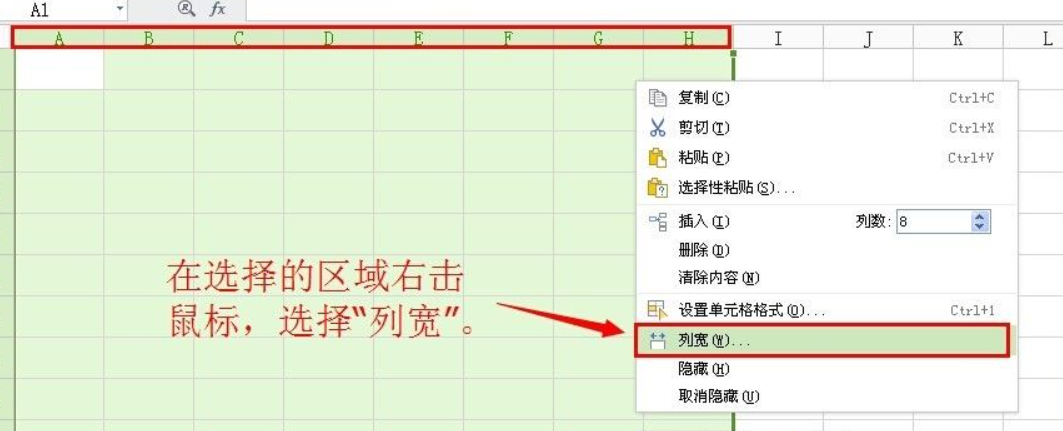 3、选择需要改动的单元格所在列的最上边的字母,然后右击鼠标,在菜单中选择“列宽”。