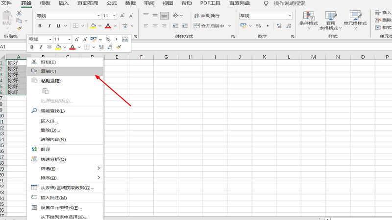 双击打开excel,选取需要行数内容,右击复制。