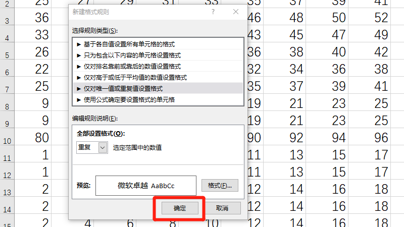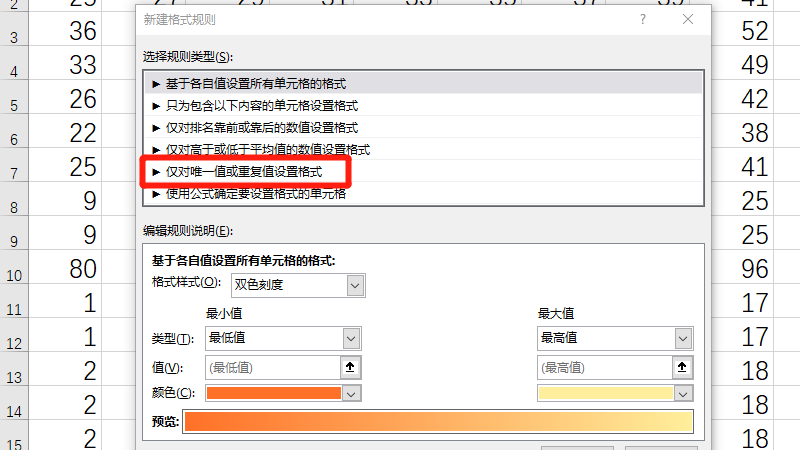 在展开的窗口中,选择仅对唯一值或重复值设置格式。