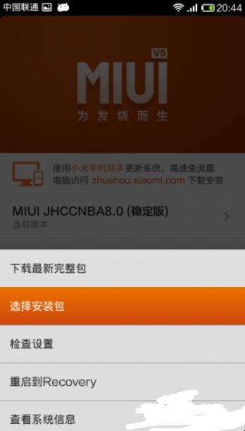 4、刷机教程:可进入系统更新,按菜单键选择你盘里的rom包。
