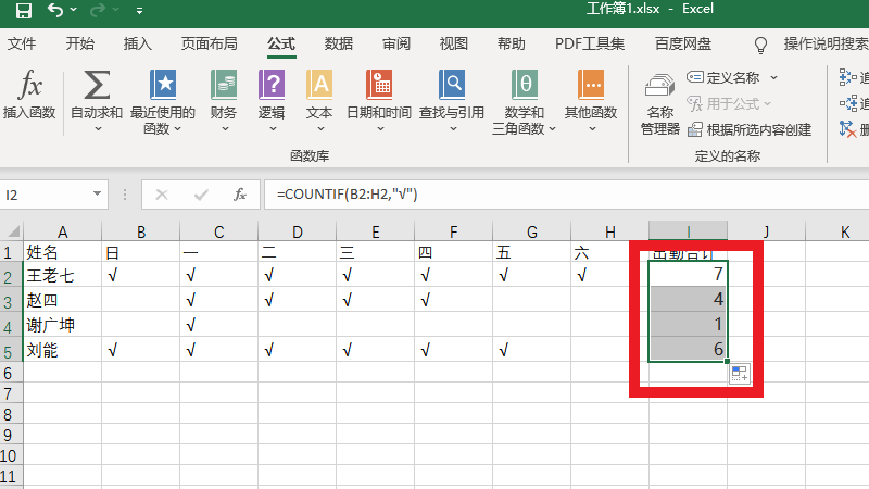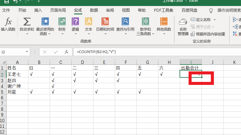 在Excel表格界面中,输入=COUNTIF(B2:H2,"√")。