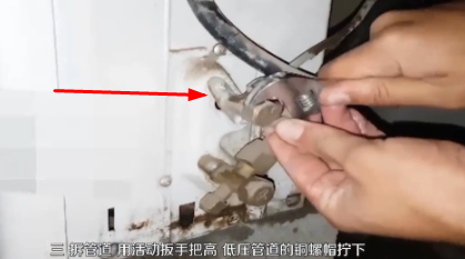 5、此时可进行拆机操作,拆下室内,外机的联接管道,拆下室内外机间的电缆。在拆下的联通铜管时要注意清洁,用塑料袋将管道口和三通阀门的接口都封起来避免灰尘杂质的进入。