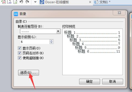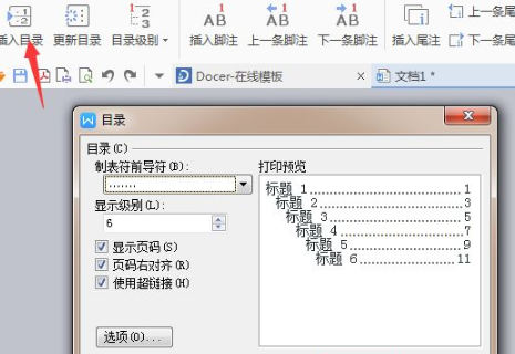 2、然后点击“插入目录”,会弹出下面的对话框,根据自己的要求设置相关内容。