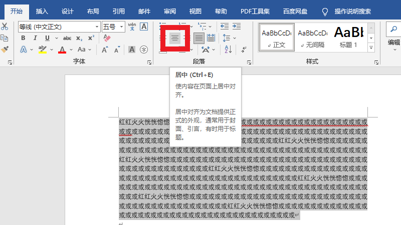 在选中文字后,点击居中即可。