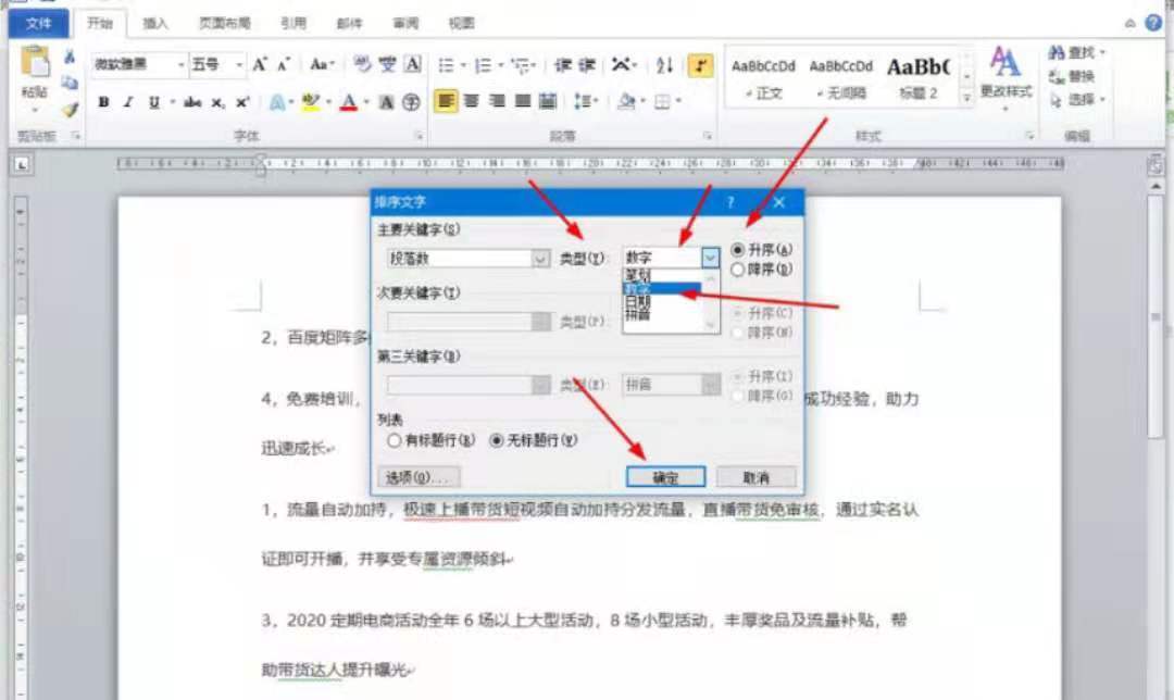 5、接着在对话框中类型选择数字升序然后点击确定即可。