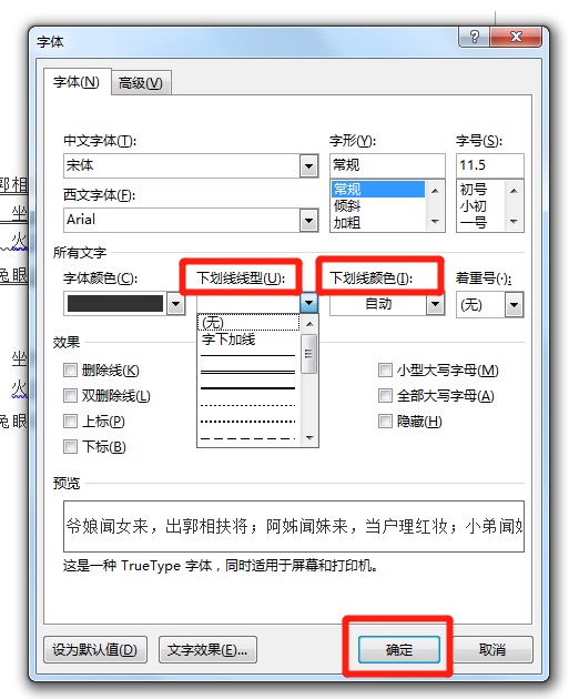 在打开的窗口中,找到下划线线性,根据需求选择线型和颜色,点击确定即可。