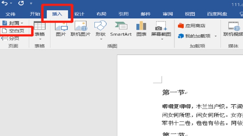 点击顶部菜单栏中的插入,点击分页即可在目录前面加空白页。