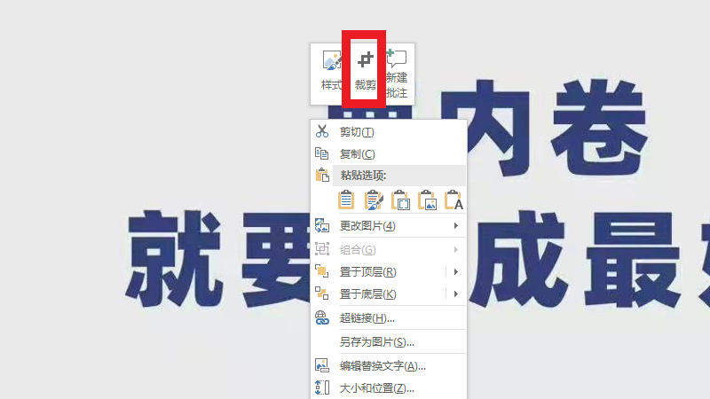 在PPT鼠标右击界面中,点击裁剪。