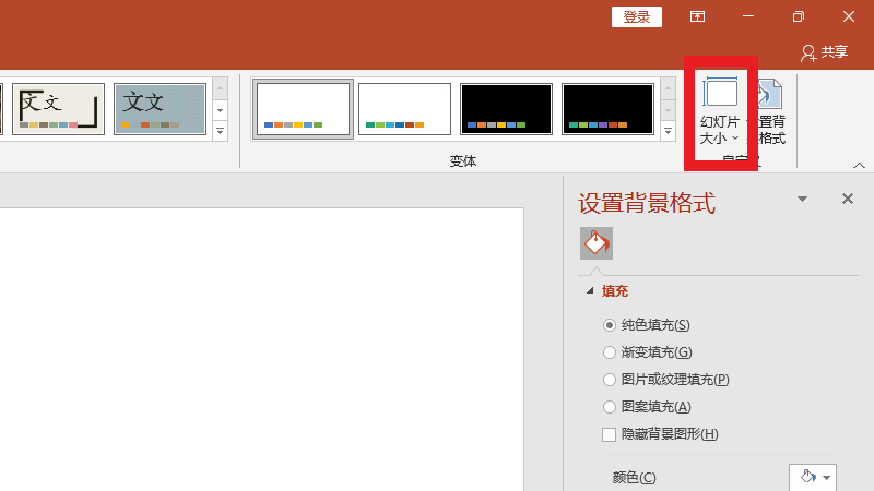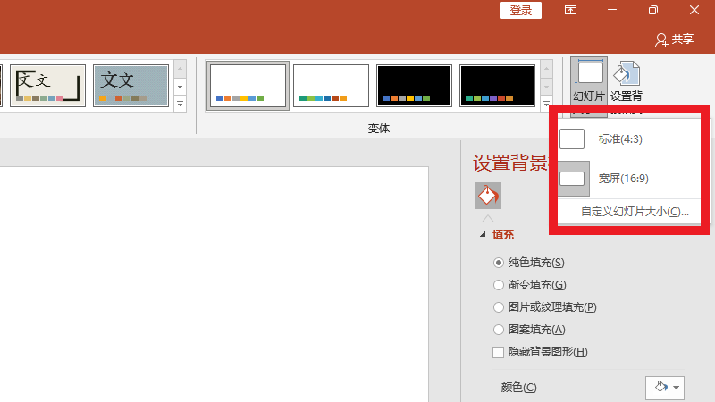 在设计界面中,点击幻灯片大小。