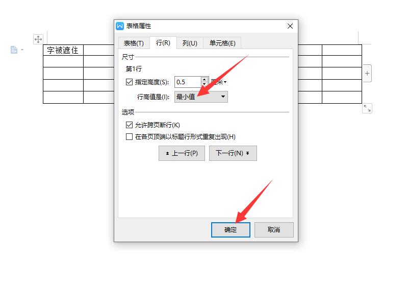 在行选项中,选择指定高度前面勾,点击固定值下拉箭头,选择最小值,确定。